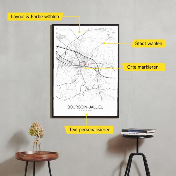Wähle Farben und Layouts, die perfekt zu dir passen. Ob als klassische Karte in schwarz-weiß oder in modernen Farben. Bei Cartida kannst du ein Design in deinen Lieblingsfarben wählen. Erstelle eine Variante von Bourgoin-Jallieu, die perfekt zu dir und deiner Wohnung passt.