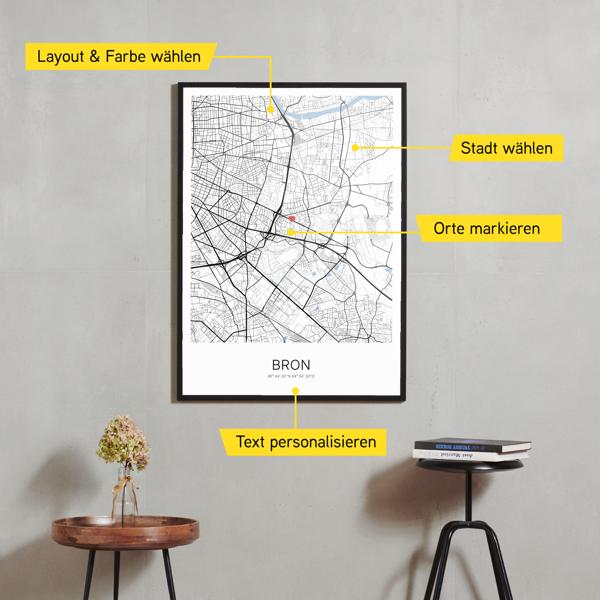 Wähle Farben und Layouts, die perfekt zu dir passen. Ob als klassische Karte in schwarz-weiß oder in modernen Farben. Bei Cartida kannst du ein Design in deinen Lieblingsfarben wählen. Erstelle eine Variante von Bron, die perfekt zu dir und deiner Wohnung passt.