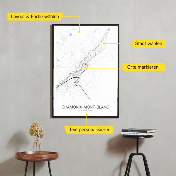 Wähle Farben und Layouts, die perfekt zu dir passen. Ob als klassische Karte in schwarz-weiß oder in modernen Farben. Bei Cartida kannst du ein Design in deinen Lieblingsfarben wählen. Erstelle eine Variante von Chamonix-Mont-Blanc, die perfekt zu dir und deiner Wohnung passt.