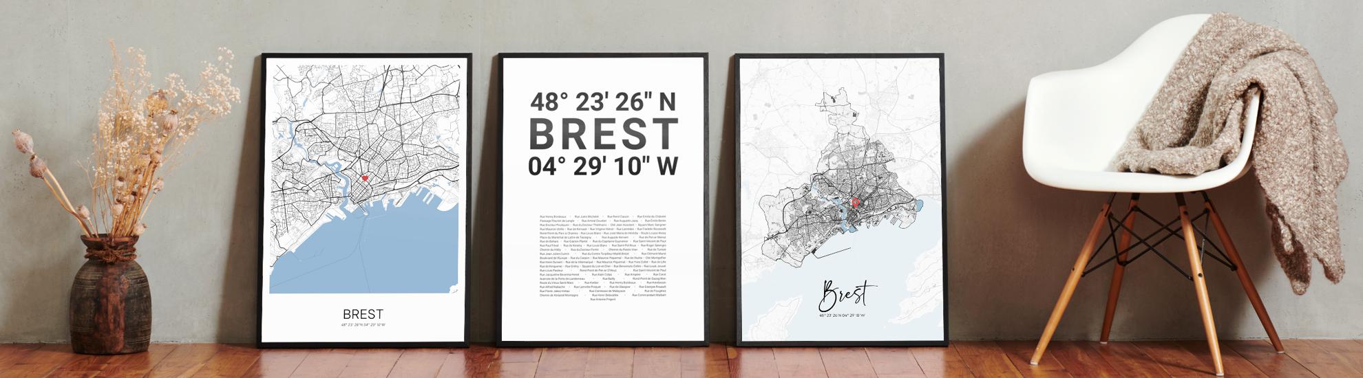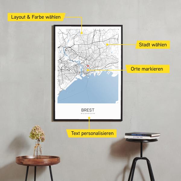 Wähle Farben und Layouts, die perfekt zu dir passen. Ob als klassische Karte in schwarz-weiß oder in modernen Farben. Bei Cartida kannst du ein Design in deinen Lieblingsfarben wählen. Erstelle eine Variante von Brest, die perfekt zu dir und deiner Wohnung passt.