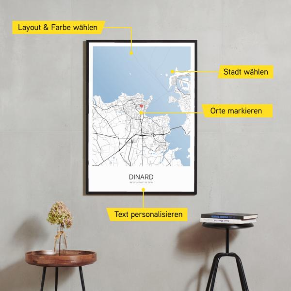 Wähle Farben und Layouts, die perfekt zu dir passen. Ob als klassische Karte in schwarz-weiß oder in modernen Farben. Bei Cartida kannst du ein Design in deinen Lieblingsfarben wählen. Erstelle eine Variante von Dinard, die perfekt zu dir und deiner Wohnung passt.