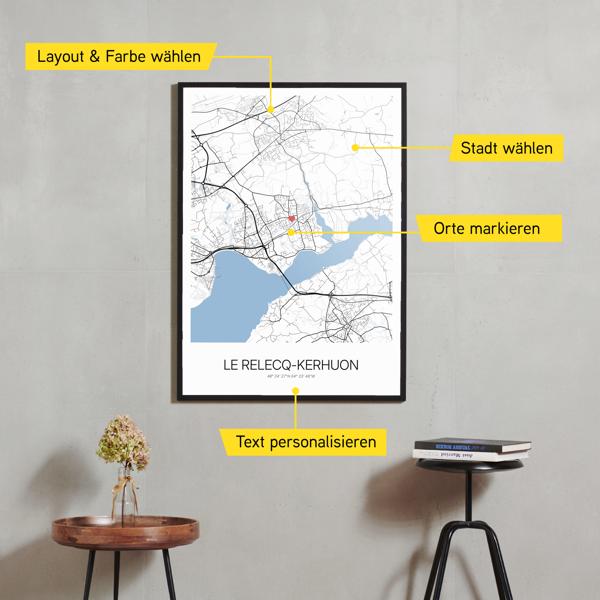 Wähle Farben und Layouts, die perfekt zu dir passen. Ob als klassische Karte in schwarz-weiß oder in modernen Farben. Bei Cartida kannst du ein Design in deinen Lieblingsfarben wählen. Erstelle eine Variante von Le Relecq-Kerhuon, die perfekt zu dir und deiner Wohnung passt.