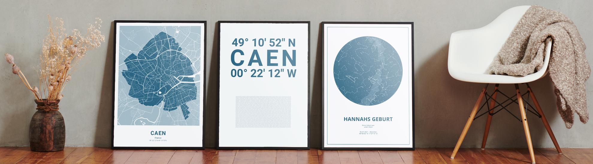 Wähle Farben und Layouts, die perfekt zu dir passen. Ob als klassische Karte in schwarz-weiß oder in modernen Farben. Bei Cartida kannst du ein Design in deinen Lieblingsfarben wählen. Erstelle eine Variante von Caen, die perfekt zu dir und deiner Wohnung passt.
