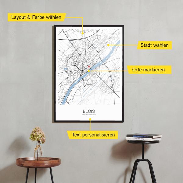 Wähle Farben und Layouts, die perfekt zu dir passen. Ob als klassische Karte in schwarz-weiß oder in modernen Farben. Bei Cartida kannst du ein Design in deinen Lieblingsfarben wählen. Erstelle eine Variante von Blois, die perfekt zu dir und deiner Wohnung passt.