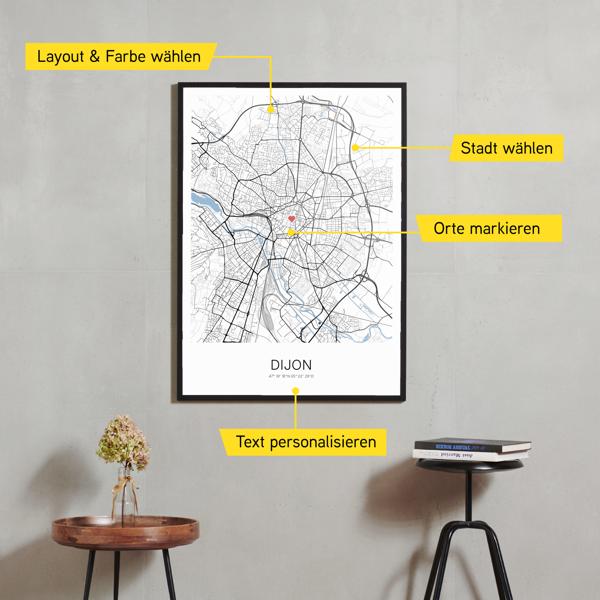 Wähle Farben und Layouts, die perfekt zu dir passen. Ob als klassische Karte in schwarz-weiß oder in modernen Farben. Bei Cartida kannst du ein Design in deinen Lieblingsfarben wählen. Erstelle eine Variante von Dijon, die perfekt zu dir und deiner Wohnung passt.