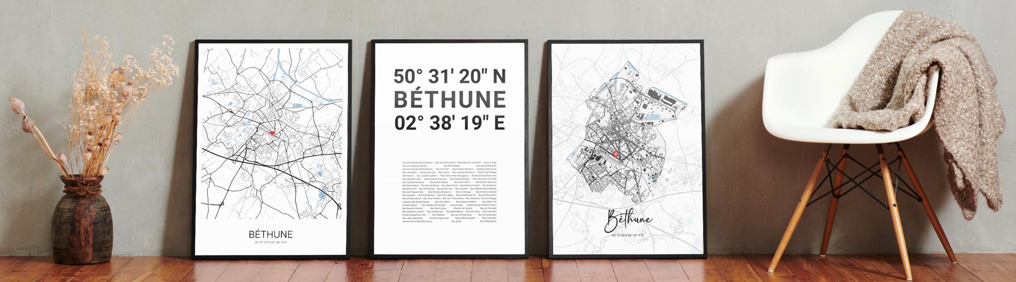 Wähle Farben und Layouts, die perfekt zu dir passen. Ob als klassische Karte in schwarz-weiß oder in modernen Farben. Bei Cartida kannst du ein Design in deinen Lieblingsfarben wählen. Erstelle eine Variante von Béthune, die perfekt zu dir und deiner Wohnung passt.