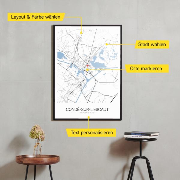 Wähle Farben und Layouts, die perfekt zu dir passen. Ob als klassische Karte in schwarz-weiß oder in modernen Farben. Bei Cartida kannst du ein Design in deinen Lieblingsfarben wählen. Erstelle eine Variante von Condé-sur-l'Escaut, die perfekt zu dir und deiner Wohnung passt.
