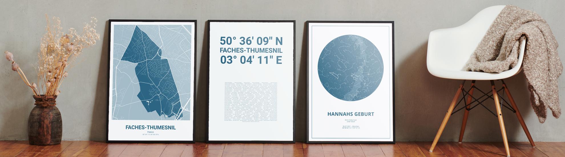Zahlen, die die Welt bedeuten. Erstelle jetzt dein persönliches Koordinaten-Kunstwerk von deiner Lieblingsstadt. Entscheide selbst, ob Stadtteile, Straßen oder ganz eigene Texte abgedruckt werden. Perfekt als Geschenk zum Einzug oder für die eigenen vier Wände.