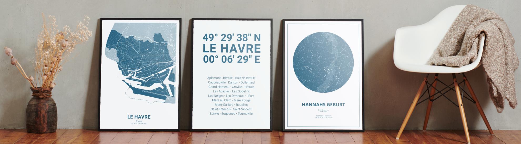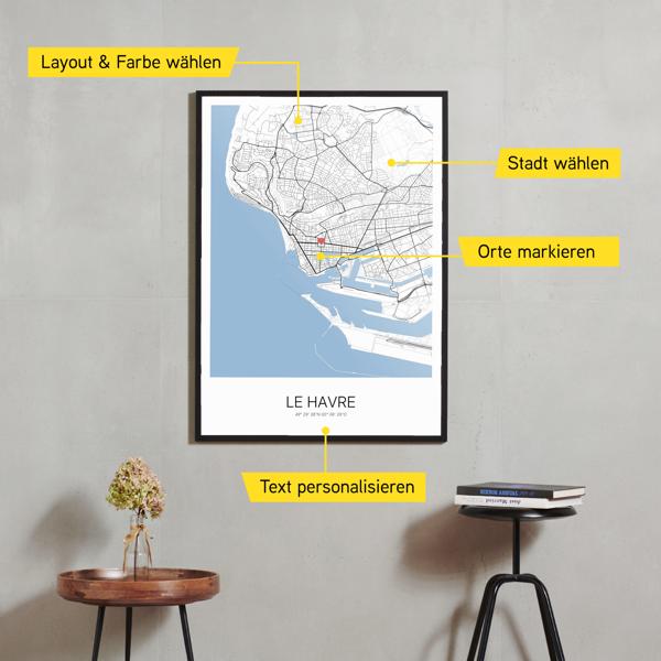 Wähle Farben und Layouts, die perfekt zu dir passen. Ob als klassische Karte in schwarz-weiß oder in modernen Farben. Bei Cartida kannst du ein Design in deinen Lieblingsfarben wählen. Erstelle eine Variante von Le Havre, die perfekt zu dir und deiner Wohnung passt.
