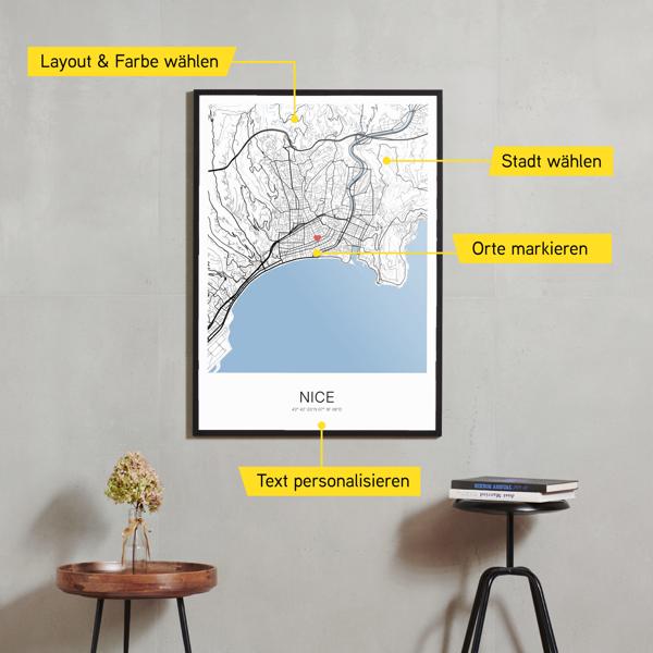 Wähle Farben und Layouts, die perfekt zu dir passen. Ob als klassische Karte in schwarz-weiß oder in modernen Farben. Bei Cartida kannst du ein Design in deinen Lieblingsfarben wählen. Erstelle eine Variante von Nice, die perfekt zu dir und deiner Wohnung passt.