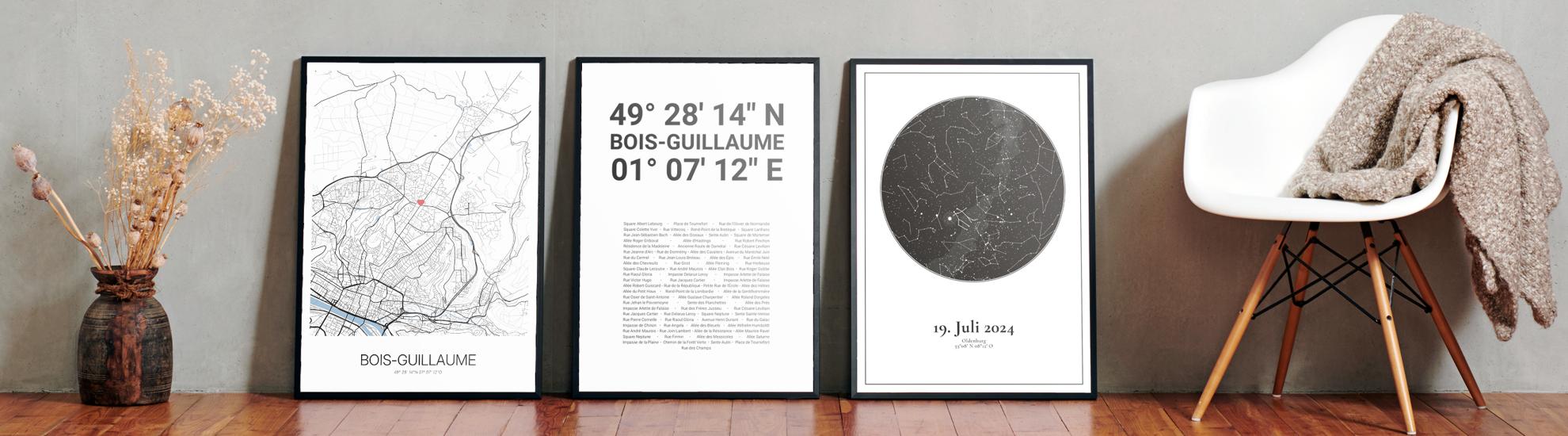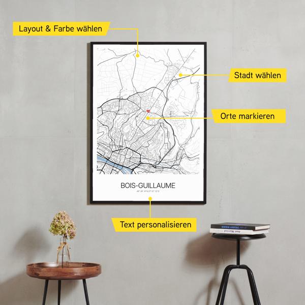 Wähle Farben und Layouts, die perfekt zu dir passen. Ob als klassische Karte in schwarz-weiß oder in modernen Farben. Bei Cartida kannst du ein Design in deinen Lieblingsfarben wählen. Erstelle eine Variante von Bois-Guillaume, die perfekt zu dir und deiner Wohnung passt.