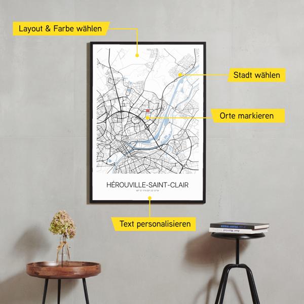 Wähle Farben und Layouts, die perfekt zu dir passen. Ob als klassische Karte in schwarz-weiß oder in modernen Farben. Bei Cartida kannst du ein Design in deinen Lieblingsfarben wählen. Erstelle eine Variante von Hérouville-Saint-Clair, die perfekt zu dir und deiner Wohnung passt.