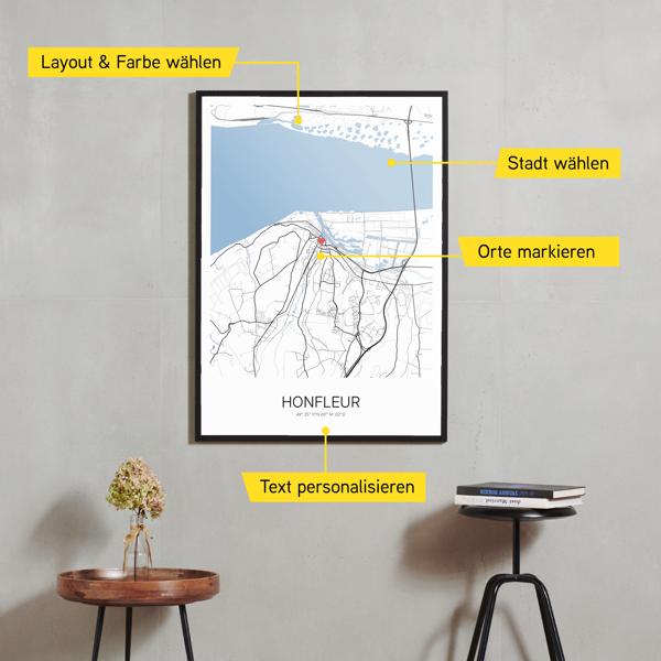 Wähle Farben und Layouts, die perfekt zu dir passen. Ob als klassische Karte in schwarz-weiß oder in modernen Farben. Bei Cartida kannst du ein Design in deinen Lieblingsfarben wählen. Erstelle eine Variante von Honfleur, die perfekt zu dir und deiner Wohnung passt.