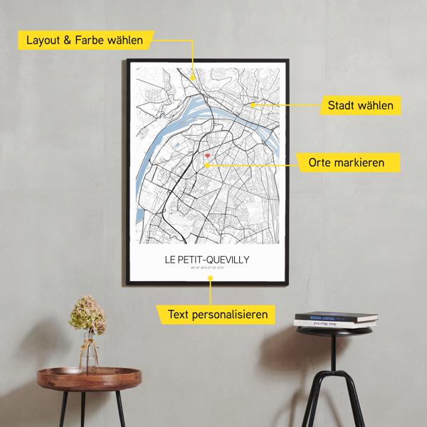 Wähle Farben und Layouts, die perfekt zu dir passen. Ob als klassische Karte in schwarz-weiß oder in modernen Farben. Bei Cartida kannst du ein Design in deinen Lieblingsfarben wählen. Erstelle eine Variante von Le Petit-Quevilly, die perfekt zu dir und deiner Wohnung passt.