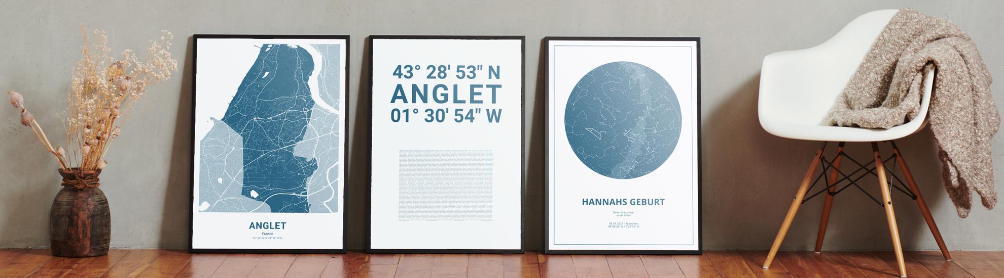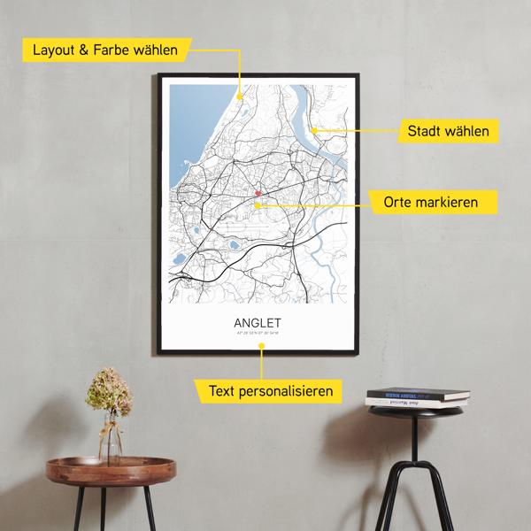 Wähle Farben und Layouts, die perfekt zu dir passen. Ob als klassische Karte in schwarz-weiß oder in modernen Farben. Bei Cartida kannst du ein Design in deinen Lieblingsfarben wählen. Erstelle eine Variante von Anglet, die perfekt zu dir und deiner Wohnung passt.