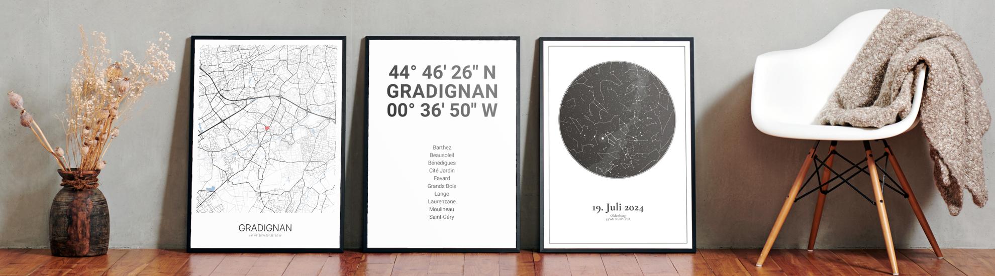 Wähle Farben und Layouts, die perfekt zu dir passen. Ob als klassische Karte in schwarz-weiß oder in modernen Farben. Bei Cartida kannst du ein Design in deinen Lieblingsfarben wählen. Erstelle eine Variante von Gradignan, die perfekt zu dir und deiner Wohnung passt.
