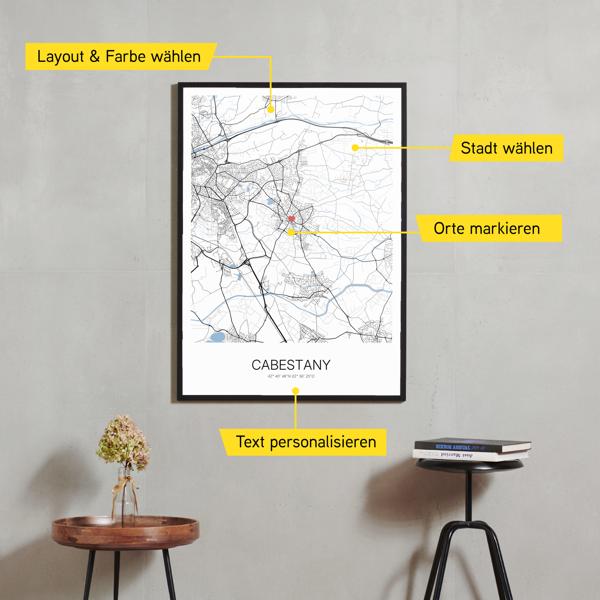 Wähle Farben und Layouts, die perfekt zu dir passen. Ob als klassische Karte in schwarz-weiß oder in modernen Farben. Bei Cartida kannst du ein Design in deinen Lieblingsfarben wählen. Erstelle eine Variante von Cabestany, die perfekt zu dir und deiner Wohnung passt.