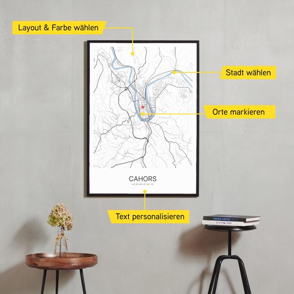 Wähle Farben und Layouts, die perfekt zu dir passen. Ob als klassische Karte in schwarz-weiß oder in modernen Farben. Bei Cartida kannst du ein Design in deinen Lieblingsfarben wählen. Erstelle eine Variante von Cahors, die perfekt zu dir und deiner Wohnung passt.