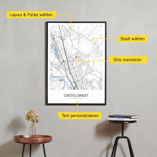 Wähle Farben und Layouts, die perfekt zu dir passen. Ob als klassische Karte in schwarz-weiß oder in modernen Farben. Bei Cartida kannst du ein Design in deinen Lieblingsfarben wählen. Erstelle eine Variante von Castelginest, die perfekt zu dir und deiner Wohnung passt.