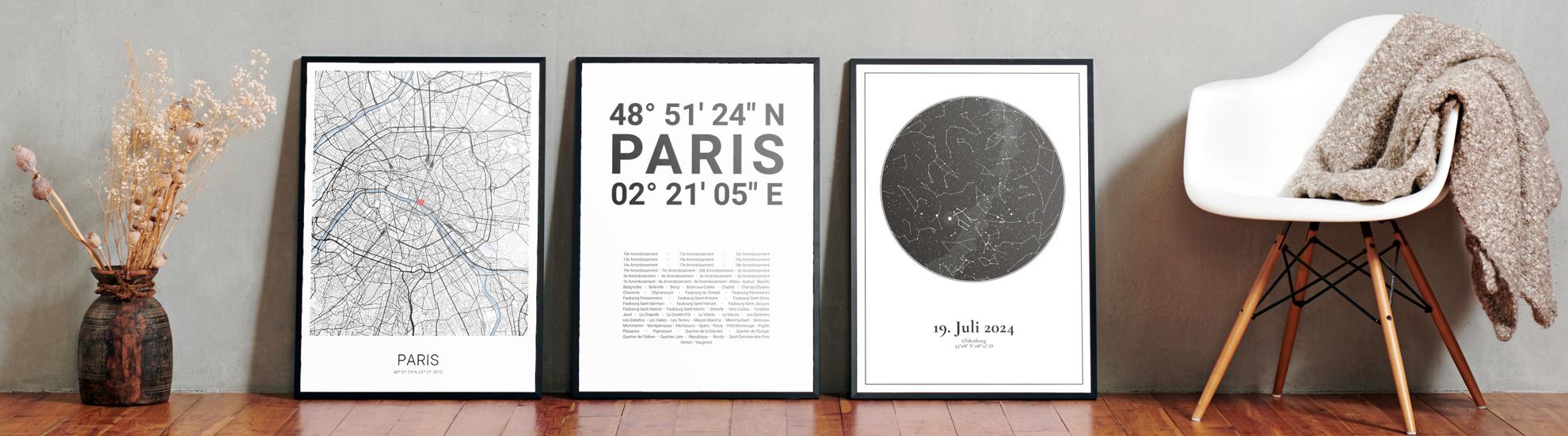Zahlen, die die Welt bedeuten. Erstelle jetzt dein persönliches Koordinaten-Kunstwerk von deiner Lieblingsstadt. Entscheide selbst, ob Stadtteile, Straßen oder ganz eigene Texte abgedruckt werden. Perfekt als Geschenk zum Einzug oder für die eigenen vier Wände.