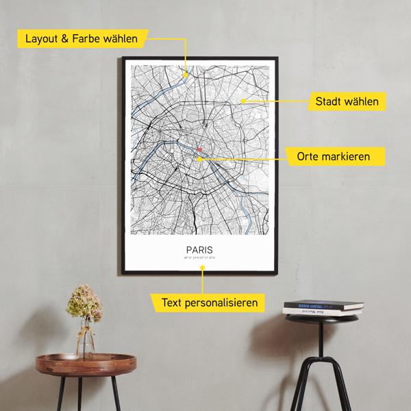 Wähle Farben und Layouts, die perfekt zu dir passen. Ob als klassische Karte in schwarz-weiß oder in modernen Farben. Bei Cartida kannst du ein Design in deinen Lieblingsfarben wählen. Erstelle eine Variante von Paris, die perfekt zu dir und deiner Wohnung passt.