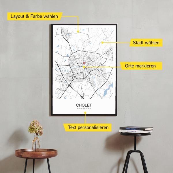 Wähle Farben und Layouts, die perfekt zu dir passen. Ob als klassische Karte in schwarz-weiß oder in modernen Farben. Bei Cartida kannst du ein Design in deinen Lieblingsfarben wählen. Erstelle eine Variante von Cholet, die perfekt zu dir und deiner Wohnung passt.