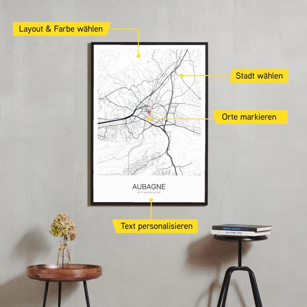 Wähle Farben und Layouts, die perfekt zu dir passen. Ob als klassische Karte in schwarz-weiß oder in modernen Farben. Bei Cartida kannst du ein Design in deinen Lieblingsfarben wählen. Erstelle eine Variante von Aubagne, die perfekt zu dir und deiner Wohnung passt.