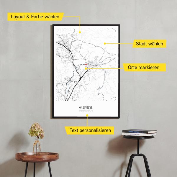 Wähle Farben und Layouts, die perfekt zu dir passen. Ob als klassische Karte in schwarz-weiß oder in modernen Farben. Bei Cartida kannst du ein Design in deinen Lieblingsfarben wählen. Erstelle eine Variante von Auriol, die perfekt zu dir und deiner Wohnung passt.