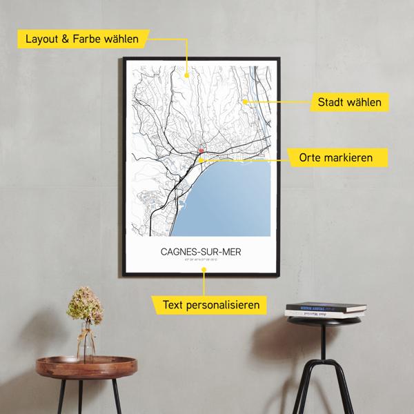 Wähle Farben und Layouts, die perfekt zu dir passen. Ob als klassische Karte in schwarz-weiß oder in modernen Farben. Bei Cartida kannst du ein Design in deinen Lieblingsfarben wählen. Erstelle eine Variante von Cagnes-sur-Mer, die perfekt zu dir und deiner Wohnung passt.