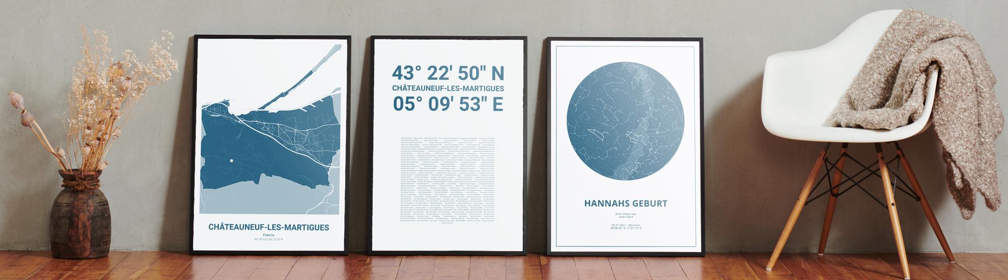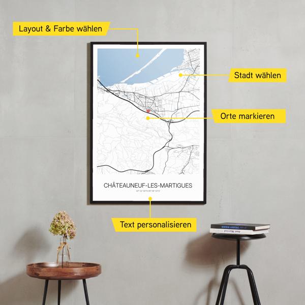 Wähle Farben und Layouts, die perfekt zu dir passen. Ob als klassische Karte in schwarz-weiß oder in modernen Farben. Bei Cartida kannst du ein Design in deinen Lieblingsfarben wählen. Erstelle eine Variante von Châteauneuf-les-Martigues, die perfekt zu dir und deiner Wohnung passt.