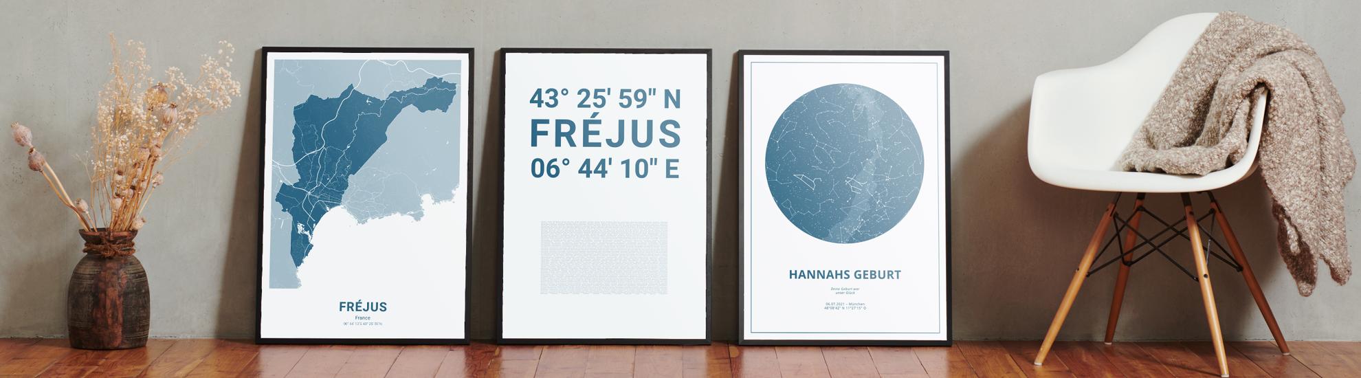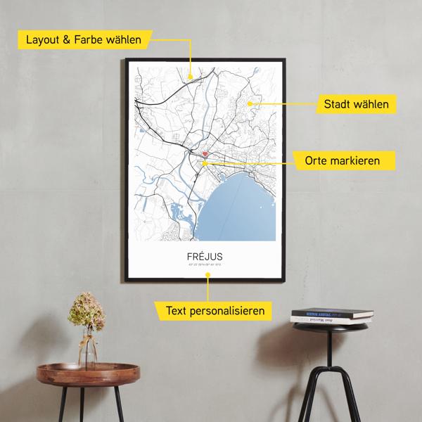 Wähle Farben und Layouts, die perfekt zu dir passen. Ob als klassische Karte in schwarz-weiß oder in modernen Farben. Bei Cartida kannst du ein Design in deinen Lieblingsfarben wählen. Erstelle eine Variante von Fréjus, die perfekt zu dir und deiner Wohnung passt.