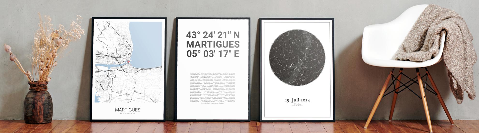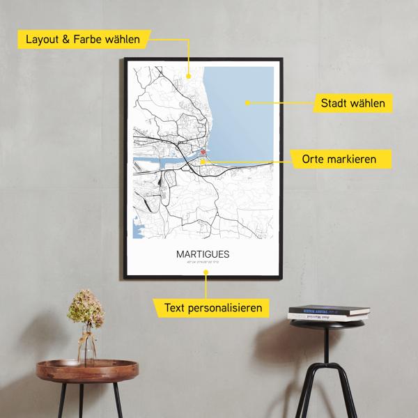 Wähle Farben und Layouts, die perfekt zu dir passen. Ob als klassische Karte in schwarz-weiß oder in modernen Farben. Bei Cartida kannst du ein Design in deinen Lieblingsfarben wählen. Erstelle eine Variante von Martigues, die perfekt zu dir und deiner Wohnung passt.