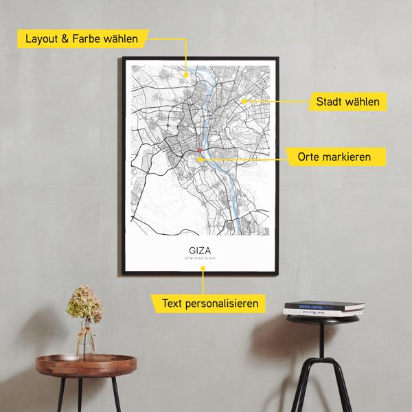 Wähle Farben und Layouts, die perfekt zu dir passen. Ob als klassische Karte in schwarz-weiß oder in modernen Farben. Bei Cartida kannst du ein Design in deinen Lieblingsfarben wählen. Erstelle eine Variante von Giza, die perfekt zu dir und deiner Wohnung passt.