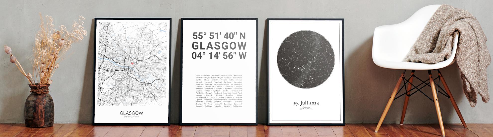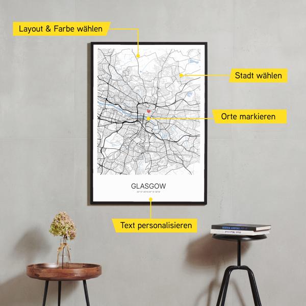 Wähle Farben und Layouts, die perfekt zu dir passen. Ob als klassische Karte in schwarz-weiß oder in modernen Farben. Bei Cartida kannst du ein Design in deinen Lieblingsfarben wählen. Erstelle eine Variante von Glasgow, die perfekt zu dir und deiner Wohnung passt.