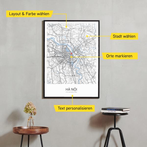 Wähle Farben und Layouts, die perfekt zu dir passen. Ob als klassische Karte in schwarz-weiß oder in modernen Farben. Bei Cartida kannst du ein Design in deinen Lieblingsfarben wählen. Erstelle eine Variante von Hà Nội, die perfekt zu dir und deiner Wohnung passt.