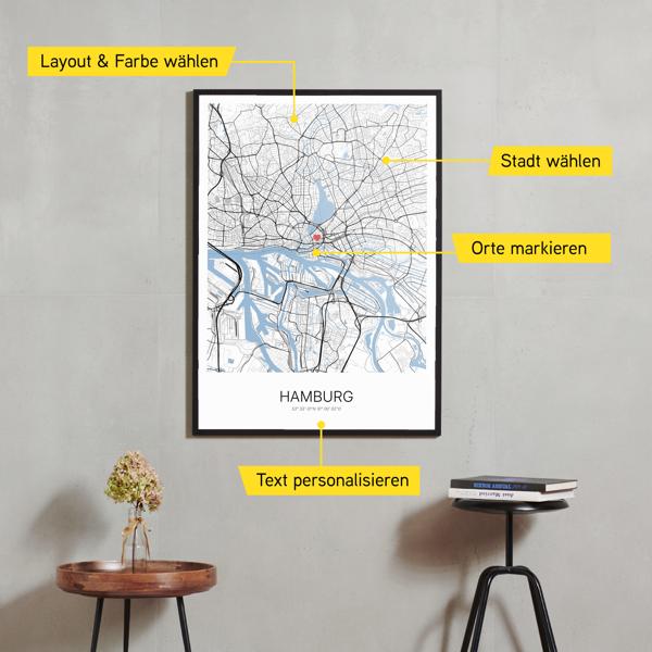 Wähle Farben und Layouts, die perfekt zu dir passen. Ob als klassische Karte in schwarz-weiß oder in modernen Farben. Bei Cartida kannst du ein Design in deinen Lieblingsfarben wählen. Erstelle eine Variante von Hamburg, die perfekt zu dir und deiner Wohnung passt.