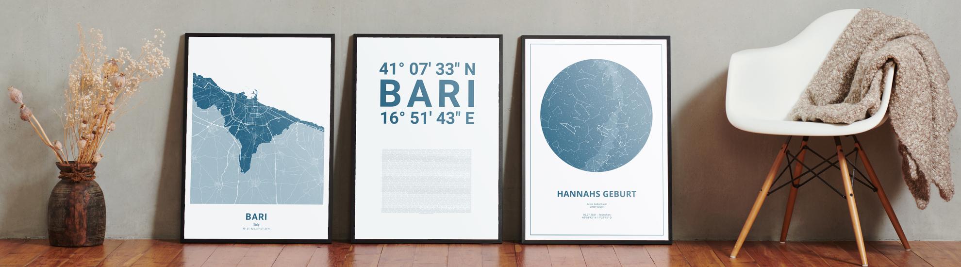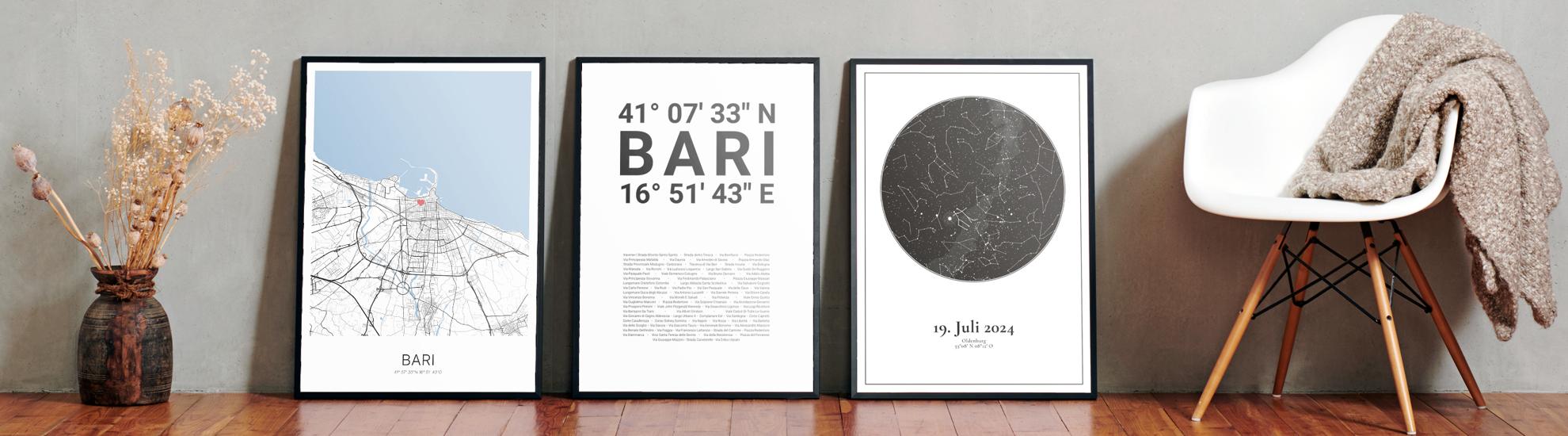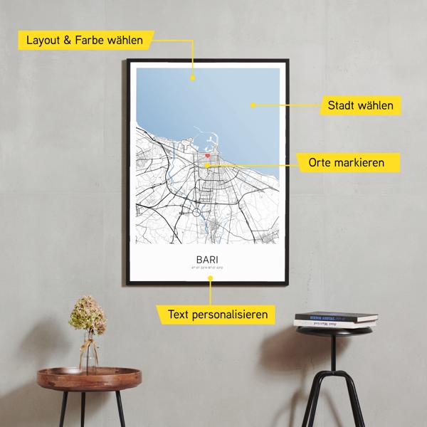 Wähle Farben und Layouts, die perfekt zu dir passen. Ob als klassische Karte in schwarz-weiß oder in modernen Farben. Bei Cartida kannst du ein Design in deinen Lieblingsfarben wählen. Erstelle eine Variante von Bari, die perfekt zu dir und deiner Wohnung passt.