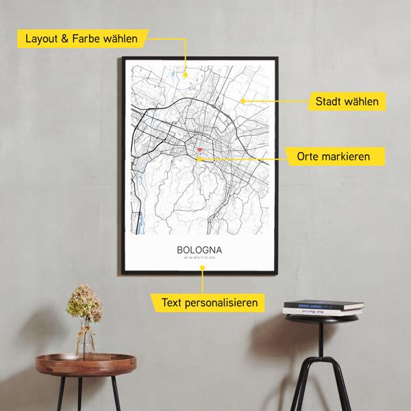 Wähle Farben und Layouts, die perfekt zu dir passen. Ob als klassische Karte in schwarz-weiß oder in modernen Farben. Bei Cartida kannst du ein Design in deinen Lieblingsfarben wählen. Erstelle eine Variante von Bologna, die perfekt zu dir und deiner Wohnung passt.