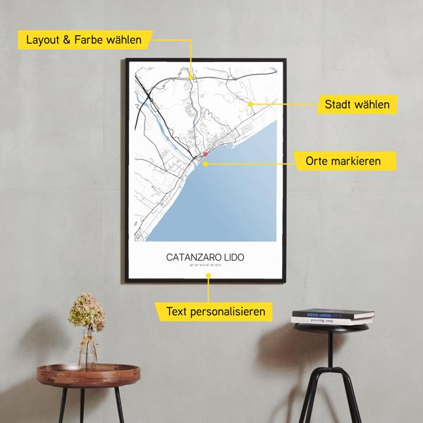 Wähle Farben und Layouts, die perfekt zu dir passen. Ob als klassische Karte in schwarz-weiß oder in modernen Farben. Bei Cartida kannst du ein Design in deinen Lieblingsfarben wählen. Erstelle eine Variante von Catanzaro Lido, die perfekt zu dir und deiner Wohnung passt.