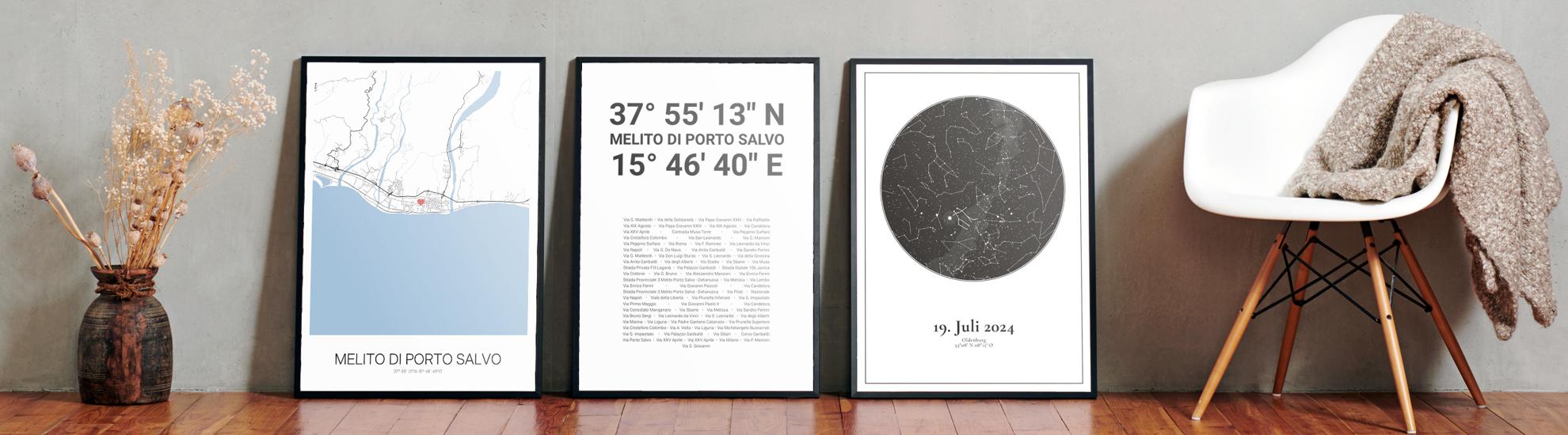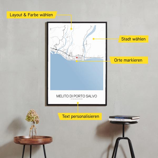 Wähle Farben und Layouts, die perfekt zu dir passen. Ob als klassische Karte in schwarz-weiß oder in modernen Farben. Bei Cartida kannst du ein Design in deinen Lieblingsfarben wählen. Erstelle eine Variante von Melito di Porto Salvo, die perfekt zu dir und deiner Wohnung passt.
