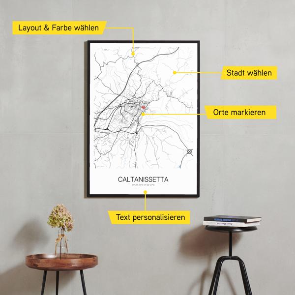 Wähle Farben und Layouts, die perfekt zu dir passen. Ob als klassische Karte in schwarz-weiß oder in modernen Farben. Bei Cartida kannst du ein Design in deinen Lieblingsfarben wählen. Erstelle eine Variante von Caltanissetta, die perfekt zu dir und deiner Wohnung passt.