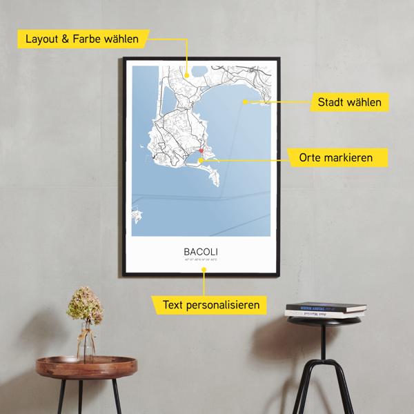 Wähle Farben und Layouts, die perfekt zu dir passen. Ob als klassische Karte in schwarz-weiß oder in modernen Farben. Bei Cartida kannst du ein Design in deinen Lieblingsfarben wählen. Erstelle eine Variante von Bacoli, die perfekt zu dir und deiner Wohnung passt.