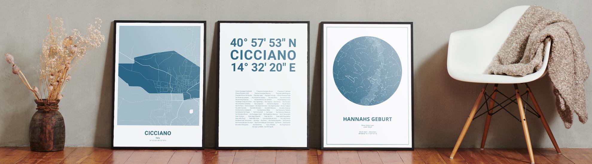 Wähle Farben und Layouts, die perfekt zu dir passen. Ob als klassische Karte in schwarz-weiß oder in modernen Farben. Bei Cartida kannst du ein Design in deinen Lieblingsfarben wählen. Erstelle eine Variante von Cicciano, die perfekt zu dir und deiner Wohnung passt.