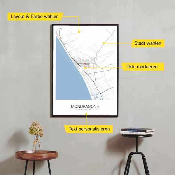 Wähle Farben und Layouts, die perfekt zu dir passen. Ob als klassische Karte in schwarz-weiß oder in modernen Farben. Bei Cartida kannst du ein Design in deinen Lieblingsfarben wählen. Erstelle eine Variante von Mondragone, die perfekt zu dir und deiner Wohnung passt.