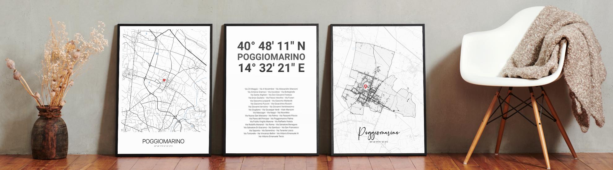 Wähle Farben und Layouts, die perfekt zu dir passen. Ob als klassische Karte in schwarz-weiß oder in modernen Farben. Bei Cartida kannst du ein Design in deinen Lieblingsfarben wählen. Erstelle eine Variante von Poggiomarino, die perfekt zu dir und deiner Wohnung passt.