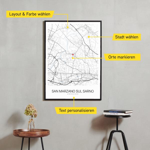 Wähle Farben und Layouts, die perfekt zu dir passen. Ob als klassische Karte in schwarz-weiß oder in modernen Farben. Bei Cartida kannst du ein Design in deinen Lieblingsfarben wählen. Erstelle eine Variante von San Marzano sul Sarno, die perfekt zu dir und deiner Wohnung passt.