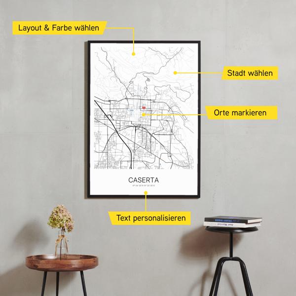 Wähle Farben und Layouts, die perfekt zu dir passen. Ob als klassische Karte in schwarz-weiß oder in modernen Farben. Bei Cartida kannst du ein Design in deinen Lieblingsfarben wählen. Erstelle eine Variante von Caserta, die perfekt zu dir und deiner Wohnung passt.