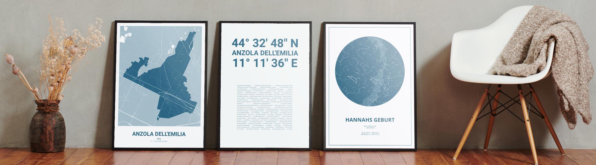 Wähle Farben und Layouts, die perfekt zu dir passen. Ob als klassische Karte in schwarz-weiß oder in modernen Farben. Bei Cartida kannst du ein Design in deinen Lieblingsfarben wählen. Erstelle eine Variante von Anzola dell'Emilia, die perfekt zu dir und deiner Wohnung passt.