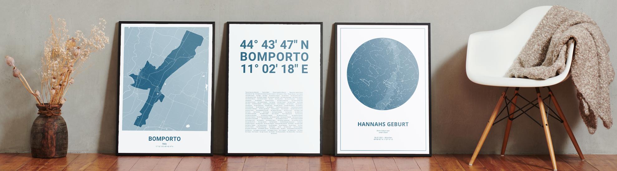 Zahlen, die die Welt bedeuten. Erstelle jetzt dein persönliches Koordinaten-Kunstwerk von deiner Lieblingsstadt. Entscheide selbst, ob Stadtteile, Straßen oder ganz eigene Texte abgedruckt werden. Perfekt als Geschenk zum Einzug oder für die eigenen vier Wände.