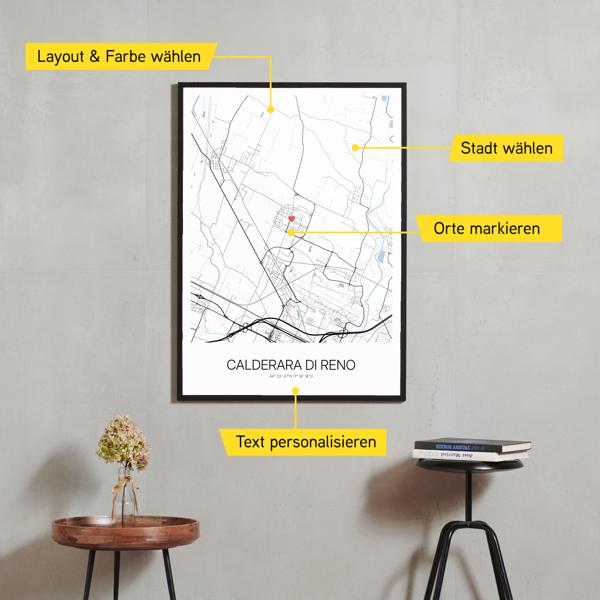 Wähle Farben und Layouts, die perfekt zu dir passen. Ob als klassische Karte in schwarz-weiß oder in modernen Farben. Bei Cartida kannst du ein Design in deinen Lieblingsfarben wählen. Erstelle eine Variante von Calderara di Reno, die perfekt zu dir und deiner Wohnung passt.